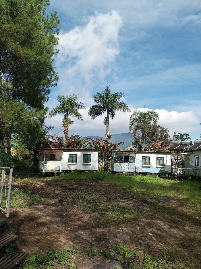 A row of small, white, box-shaped structures with windows and platform entrances sit in an overgrown yard beneath palm trees and foliage. The structures are adorned with colorful designs. Mountains rise in the distance, visible between the trees and buildings. A blue sky filled with fluffy white clouds provides the backdrop. The foreground shows a patch of ground with a mixture of grass and dirt. A metal structure stands in the left corner.