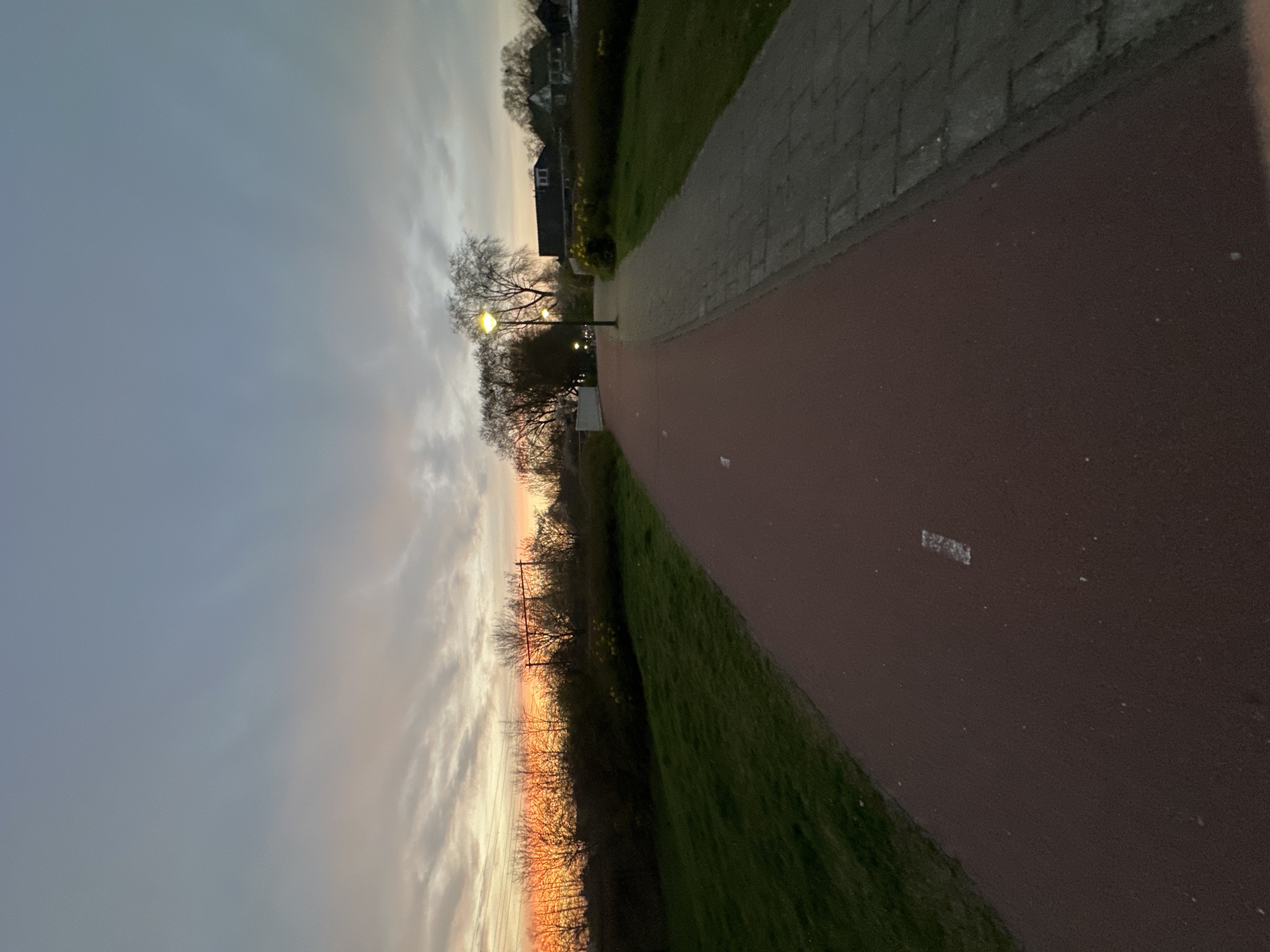 The image displays an outdoor scene at twilight in Geldrop, Netherlands, viewed along two parallel paths. The sky exhibits a gradient from a light grey-blue overhead to intense orange, yellow, and red hues at the horizon on the left, indicative of a sunset, with multiple cloud formations present. In the foreground, a wide, reddish-brown asphalt path, presumably a bicycle path, features white dashed lines and extends from the bottom of the frame towards the upper center, curving slightly right. Adjacent and to its right, a narrower, grey paved sidewalk composed of rectangular interlocking blocks runs parallel. Both paths are bordered by strips of green grass and low, dark bushes. On the left side of the frame, a dense line of bare-branched trees and dark shrubs is silhouetted against the brightly illuminated horizon. Above these trees, thin electrical wires and a dark, multi-legged metallic gantry structure are visible. On the right side, a street light with an illuminated yellow globe stands between the two paths, casting light. Another street light is visible further down the path. Patches of yellow flowering plants are observable within the bushes on the right. In the background, several residential buildings with dark roofs are partially obscured by trees on the right side. No individuals or active subjects are present in the scene.