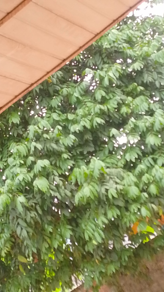 The scene depicts an outdoor environment in the city of Unknown, Unknown. The upper-left portion of the image shows an angled light brown structure, consistent with a building's eave or awning, featuring visible horizontal segments. The majority of the frame is filled with dense green foliage, characterized by numerous small to medium-sized leaves from a tree or large shrub. Bright light penetrates through gaps in the leaves, creating distinct illuminated spots. No individuals, direct actions, or interactions are visible. A darker, textured surface is faintly present in the lower-right background, possibly a wall or ground.