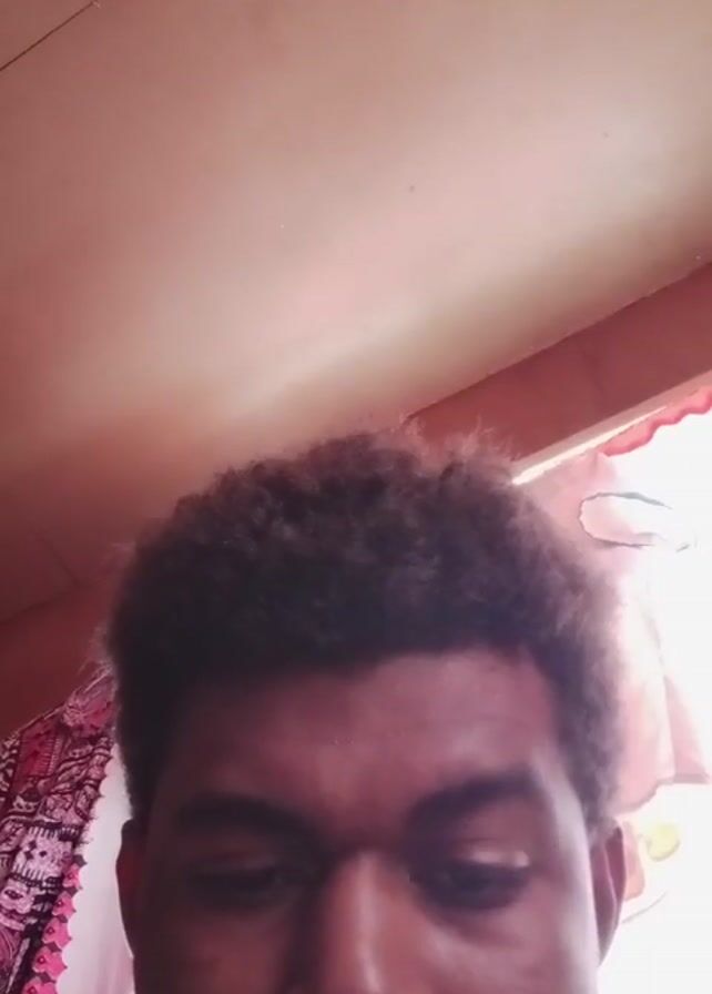 person with short, dark curly hair looking down. The person's face is visible, showing their nose, eyes, and forehead. The background includes a light-colored ceiling and a window with a patterned curtain. The lighting appears to be coming from the window. The person does not appear to be moving much.