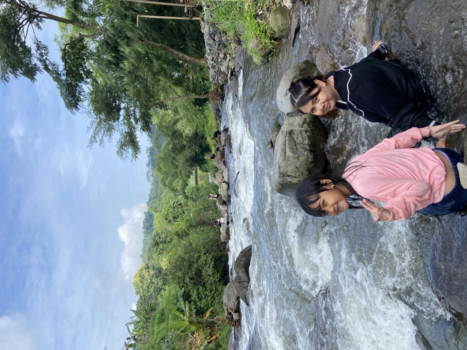 Two young girls pose in a flowing river. One wears a pink shirt and jeans, flashing a peace sign. The other wears a black jacket with white stripes. Both are positioned amongst rocks and rushing water. The river is framed by lush greenery, trees, and a partly cloudy sky. Other people can be seen further up the river sitting on rocks, enjoying the scenery.