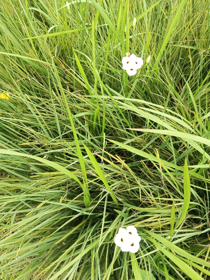The image depicts a dense patch of lush green grass, interspersed with delicate white wildflowers. The grass blades are slender and elongated, creating a textured backdrop for the focal point of the flowers. Two three-petaled white flowers stand out against the greenery. One flower is near the top-center of the frame, while the other resides towards the bottom. The image evokes a sense of tranquility and natural beauty.