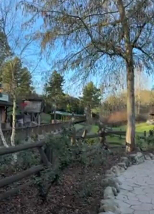green and yellow train moving through a wooded area. The train is traveling on a track that is surrounded by trees and bushes. There is a wooden fence that runs along the side of the track. The sky is blue and there are a few clouds. The video is shot from a slightly elevated position.