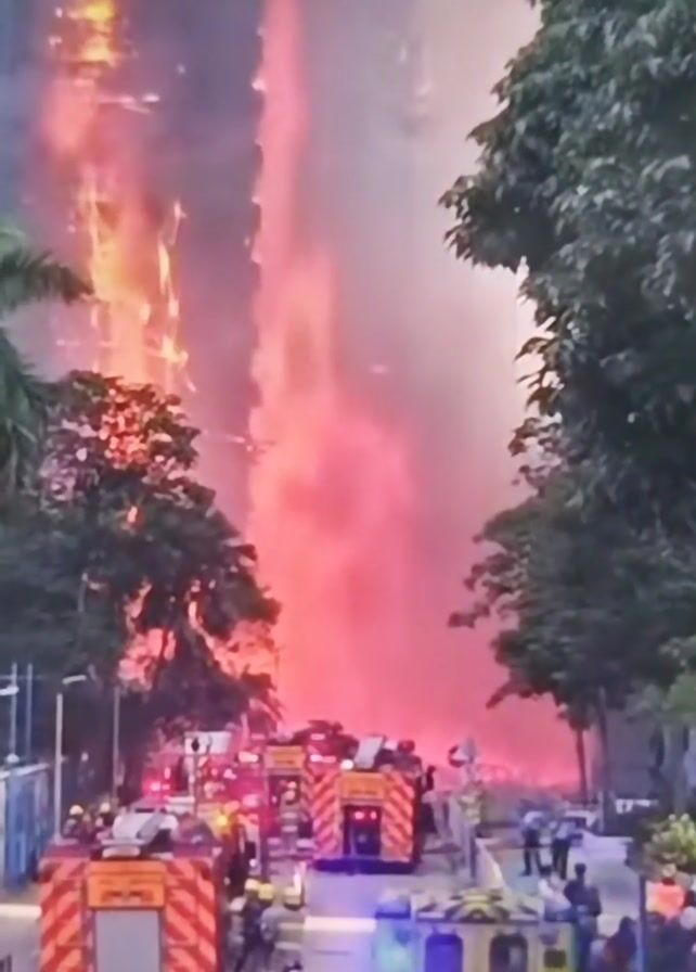 The video depicts a massive fire in the distance, with plumes of smoke filling the sky, creating a hazy, reddish-pink glow