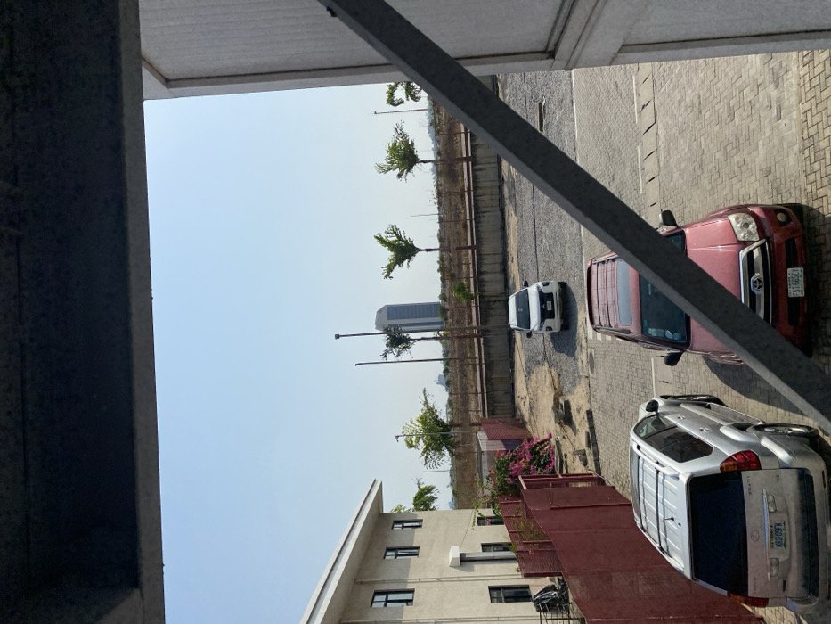 The image captures an outdoor urban scene in Inupa Kekere, Nigeria, viewed from a slightly elevated position, possibly a building window or balcony. The frame is partially obscured by dark, industrial-style structural elements: a horizontal beam across the top and a vertical/diagonal beam on the lower right. On the left, a two-story building with light-colored (off-white/beige) walls and multiple dark-framed rectangular windows is visible. A dark red fence runs along the base of this building, partially covered by green foliage and vibrant pink flowering plants, consistent with bougainvillea. The immediate foreground features a paved parking area constructed with light-colored interlocking bricks. Two sport utility vehicles (SUVs) are parked on this surface: 1. A silver Lexus GX 470, with a visible "GX470" badge and roof rack, is parked facing away from the viewer on the far left. Its Nigerian license plate reads "KKB-09FX". 2. A red Toyota 4Runner (4th generation model) with a roof rack is parked facing towards the viewer on the right side of the paved area, partially obscured by the diagonal structural beam. Its Nigerian license plate reads "LAGOS ST 565CY". Beyond the paved area, a section of dry, light-colored gravel and dirt functions as an additional parking or open space. A white Mitsubishi SUV is parked on this gravel area, facing towards the viewer, with its license plate not clearly legible. In the middle ground, a low concrete barrier topped with a brown, possibly rusted, wire fence separates the gravel area from a large expanse of undeveloped land, characterized by dry, reddish-brown earth and sparse vegetation. Several tall, slender trees, resembling palm trees, are scattered across this landscape, along with two streetlights. The background is dominated by a clear, pale blue sky, indicating bright daylight conditions. A prominent tall, light-colored, modern high-rise building with a distinctive curved or angled architectural design is visible on the distant horizon, along with faint outlines of other distant structures or topographical features. No individuals are visible within the frame, and no specific actions or interactions are depicted.