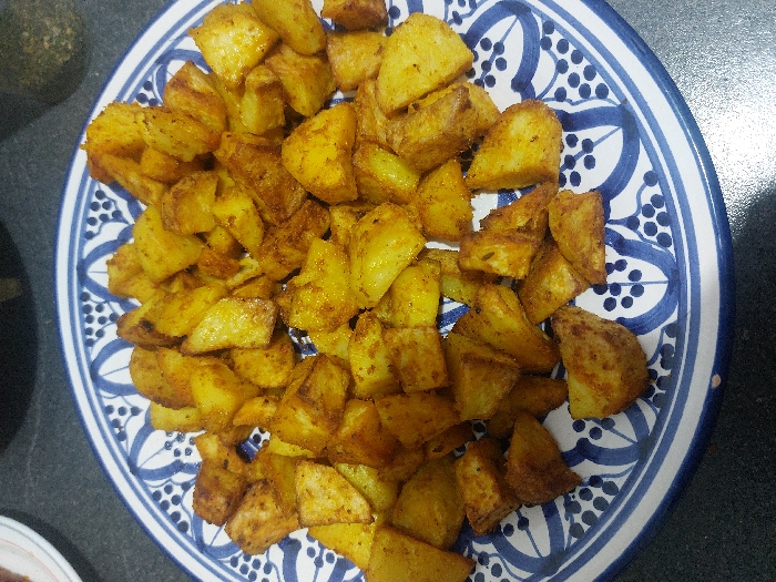 - "Golden-brown, seasoned potatoes fill a blue and white patterned plate" by FM-gCkm43, licensed under CC BY 4.0
