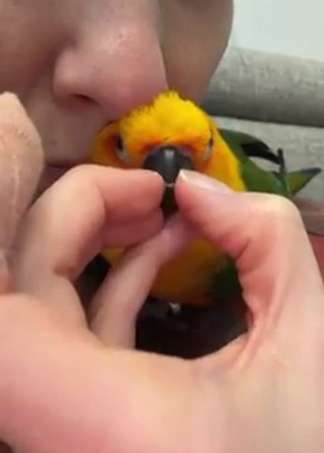 A close-up shot shows a person’s face next to a Sun Conure bird