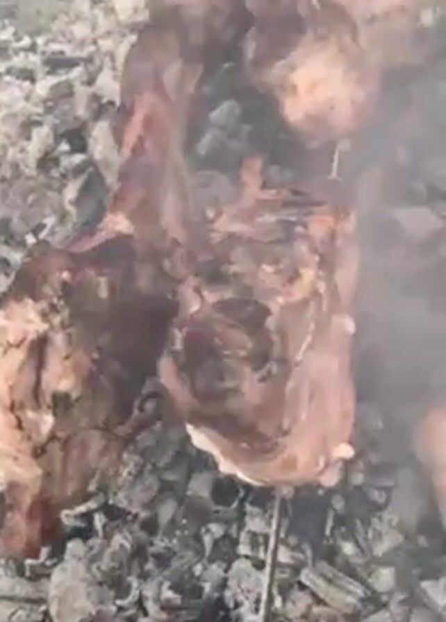 meat cooking on metal skewers over a bed of hot charcoal. The meat appears to be various cuts, some more cooked than others. There is smoke rising from the charcoal, partially obscuring the meat. A pair of metal tongs can be seen near the edge of the grill.