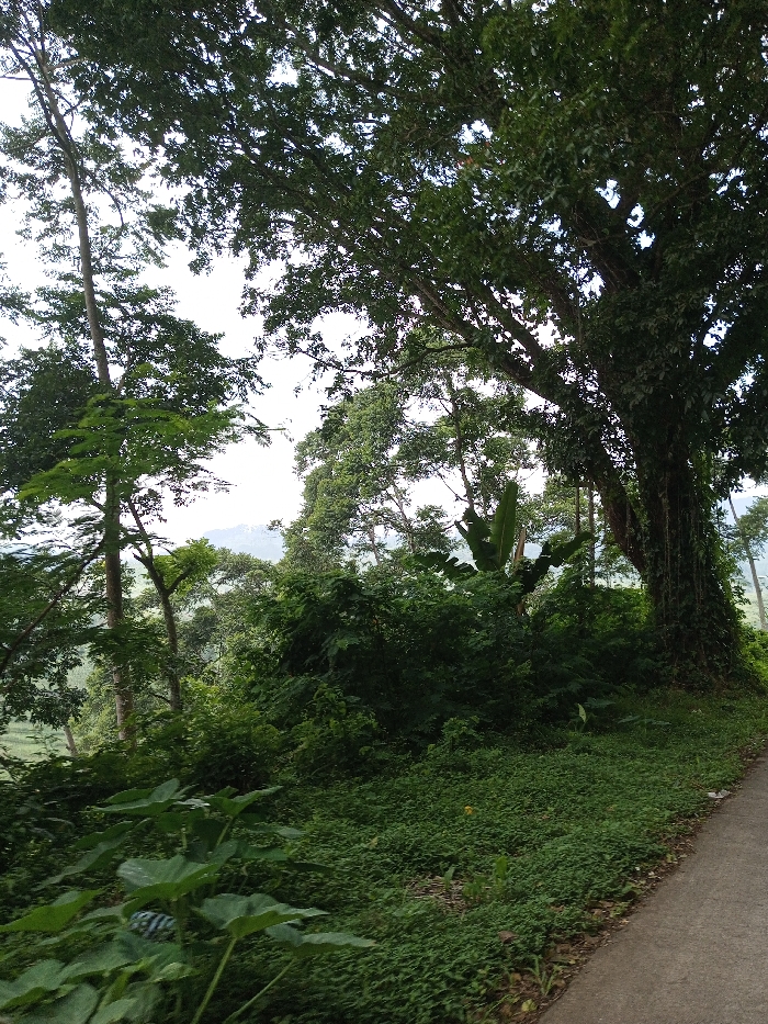 The scene depicts a verdant, heavily vegetated outdoor area in Matale, Sri Lanka. A narrow, light grey concrete or compacted dirt path occupies the right foreground and recedes into the mid-ground. Immediately adjacent to the path, the ground is covered by dense green foliage, including large, broad leaves in the lower left foreground and a thick carpet of smaller plants. A prominent, large tree with a thick trunk heavily draped in vines stands on the right, its extensive green canopy filling the upper right quadrant. Numerous other trees, featuring tall trunks and green leaves, are visible throughout the frame, with dense bushes and a banana plant identifiable in the mid-ground. Distant, tree-covered hills are visible under a bright, overcast sky. No persons, animals, or other man-made objects are present.