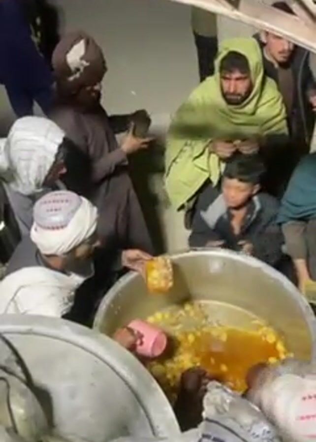 group of people surrounding a large metal pot filled with food. Several men are ladling portions of the food into smaller containers or bowls, while others eat directly from their portions. The food appears to be a stew or curry with yellow sauce and round solid ingredients. The setting seems to be indoors, under some kind of metal structure. The people are dressed in casual clothing, with some wearing traditional headwear.