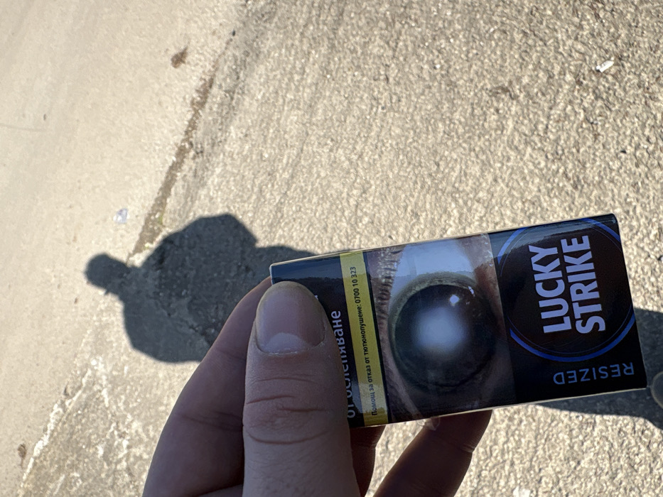 The image captures an outdoor scene under bright daylight. In the foreground, a human right hand holds a dark-colored pack of "Lucky Strike" cigarettes. The cigarette pack features a prominent health warning graphic depicting a human eye with a cataract, along with Bulgarian text stating "ОТ ОСЛЕПЯВАНЕ" (FROM BLINDNESS) and a helpline number "ПОМОЩ ЗА ОТКАЗ ОТ ТЮТЮНОПУШЕНЕ: 0700 10 323" (HELP FOR QUITTING SMOKING: 0700 10 323). The word "RESIZED" is printed vertically on the left side of the pack. The background consists of a rough, light grey asphalt or concrete surface, showing areas of wear, cracks, and some sparse debris. A distinct, elongated shadow of a person, consistent with the individual holding the camera and cigarette pack, is cast onto the ground, positioned behind the hand. The Bulgarian text on the cigarette pack indicates the scene is located in Bulgaria. No specific environmental details are present in the image to confirm a precise location within the city of Stefan Karadja.
