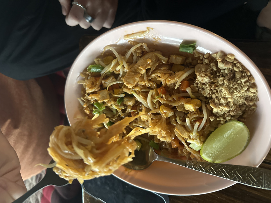 An overhead close-up image depicts a plate of Pad Thai being consumed in Ban Paem Bok, Thailand