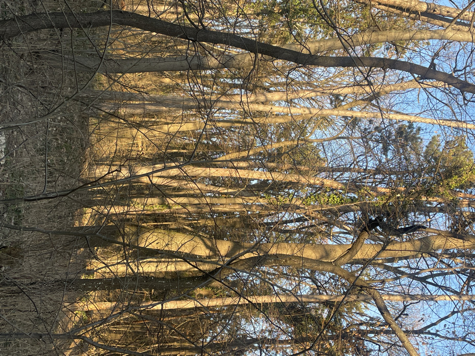 The image displays a dense, deciduous wooded area located within the city of Sofia, Bulgaria, likely a park or forest preserve. The scene is illuminated by low-angle, warm, golden sunlight, suggesting either late afternoon or early morning, consistent with late autumn or winter due to the prevalence of bare branches. Numerous tall tree trunks, primarily deciduous, extend vertically throughout the frame, their bark illuminated on one side and casting long shadows. A clear, light blue sky is visible through the canopy gaps. Interspersed among the deciduous trees, particularly towards the upper portions, are some coniferous trees with dark green needles. Green ivy vines are observed climbing the trunk of a tree in the upper-right portion of the image. The forest floor is covered with dry, sparse undergrowth, fallen leaves, and small, broken branches, indicating a natural, unmanaged environment. No human subjects are present. A small, dark, ambiguous shape, consistent with an animal such as a squirrel or bird, is discernible on a tree trunk in the upper-right-center portion of the frame, appearing to be climbing or perched. The scene is devoid of overt man-made structures or disturbances.