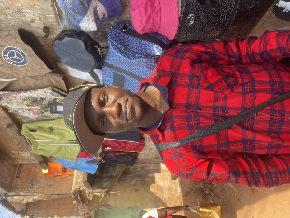 A young Black male is centered in the foreground of an outdoor scene in Nnobi, Nigeria, smiling slightly at the camera. He wears a red and blue plaid long-sleeved shirt, unbuttoned at the collar to reveal a dark undershirt, and a black baseball cap with a light brim worn backward, featuring a small yellow emblem. A black strap crosses his right shoulder. Behind the subject, a weathered, light brown wall with peeling plaster and exposed brick serves as a backdrop, displaying various items for sale. These include lime green athletic shorts, blue shorts, red and black shorts, brown shorts with a "PARIS JORDAN" logo, floral-patterned fabric, a black structured handbag, a blue patterned duffel bag with a "Gucci" logo, a pink bucket hat, and a black patterned bag with "GUCCI" hardware. A white street sign partially visible on the wall reads "BLASCOM ST". To the far left, a person is partially visible from the waist down, wearing a white and red garment and carrying a golden bag, walking away from the camera. The ground appears unpaved. The scene is illuminated by bright sunlight.