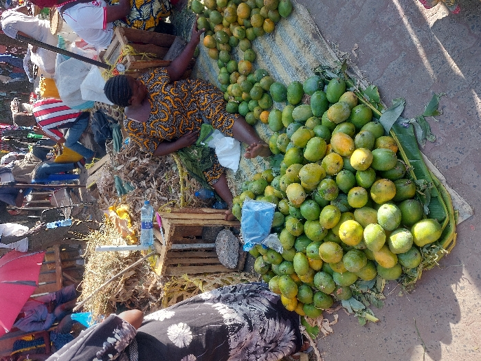 This image depicts a bustling outdoor market scene in Dar es-Salaam, Tanzania, likely a street or local market. In the foreground, a large quantity of ripe and unripe mangoes, predominantly green with some yellowing, is displayed directly on the reddish-brown ground, partially resting on banana leaves and a striped mat. A dark-skinned female vendor, wearing a patterned yellow, orange, and black dress, sits barefoot on the ground behind the mangoes, extending her right hand towards the fruit pile. To her immediate left, a wooden crate holds a plastic water bottle and a pink object. Further left, partially visible, is another individual wearing a black and white patterned dress. The midground and background reveal a crowded market environment with several other individuals, mostly men. One man wears a red and white striped shirt and blue jeans, seated on a wooden structure. Another man is seated further back, wearing a blue shirt and jeans. Various market items are visible, including large yellow jerry cans, wooden crates, a red umbrella providing shade, and scattered organic debris, such as dried leaves and plant matter. The ground throughout the scene is a mix of dirt and uneven pavement. Shadows indicate daylight conditions.