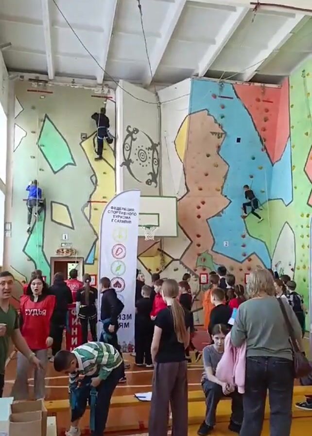interior of what appears to be a gymnasium. There are three artificial rock climbing walls set up against one wall. There are several people of varying ages in the room, some of whom are climbing the walls. Some people are observing while others are helping with the climbing activity. There is a banner that says "Федерация спортивного туризма Сарапула туризм детям". There is a basketball hoop and some tables with equipment. The floor is hardwood and the lighting is bright.