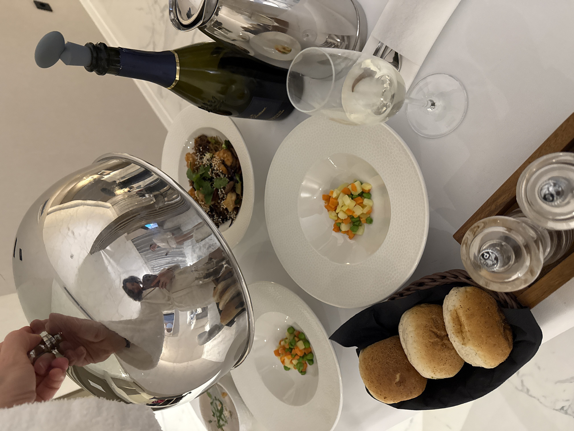 The image captures an indoor scene in Prčanj, Montenegro, featuring a table set for a meal. A person's right hand, adorned with multiple rings on the ring finger and covered by a white terry cloth robe, is in the process of lifting a domed silver cloche from a white dinner plate. The cloche's reflective surface reveals a distorted image of a woman in a white robe holding a smartphone, positioned as if taking a photograph, and a second individual also in a white robe standing further back within the room. The table is covered with a white tablecloth. Visible items on the table include: a partially obscured white bowl containing a light liquid and green garnish; two white, shallow bowls, each holding a portion of diced mixed vegetables consisting of carrots, peas, and light-colored root vegetables; a white, shallow bowl containing a main course dish, appearing to be noodles or rice topped with shrimp/meat, garnished with sesame seeds and fresh green herbs. A dark green bottle, labeled "Contessa Prosecco" and sealed with a grey silicone stopper, stands next to a silver thermal carafe. In the foreground, a stemmed wine glass holds a clear, light-colored beverage. To the lower left, a small woven basket lined with black fabric holds three light-colored bread rolls. A wooden holder containing two clear glass grinders, likely for salt and pepper, is also present on the table. The background suggests a plain, light-colored wall.
