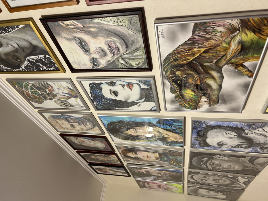 A wall is densely decorated with framed drawings. Predominantly portraits, the artwork features a diverse range of subjects including realistic human figures, a zombie-like face, and a detailed depiction of a dinosaur. The frames vary in color, with silver, black, and gold being prominent. The arrangement is tightly packed, creating a gallery-like display.