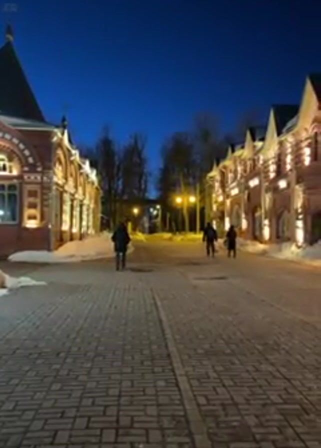 A woman with long blonde hair walks down a brick path toward the camera, turns to smile, and then continues walking away from the camera. The scene takes place at night, illuminated by streetlights. The sky is a deep blue. The path is lined on either side by brick buildings with decorative architecture. There is snow on the ground. Other people can be seen walking in the distance.