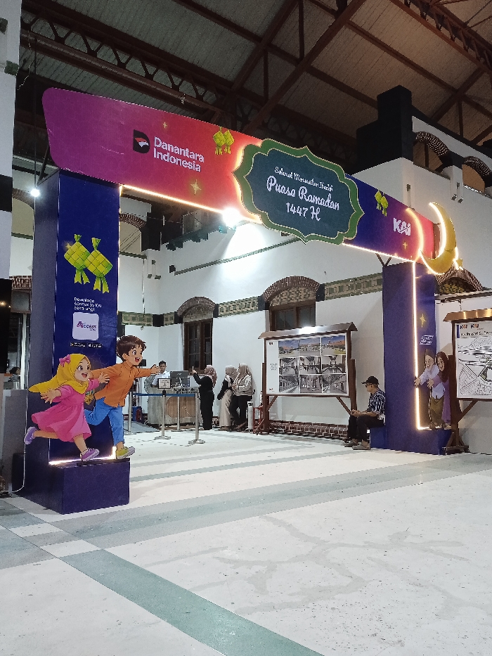 The image depicts an indoor scene within Lawang Sewu, a historic building located in Semarang, Indonesia, characterized by its high vaulted ceilings with exposed steel trusses, white walls, and arched brick-framed windows. The central focus is a large, illuminated archway or gate structure, likely for a Ramadan event. The archway's horizontal top banner displays a purple-to-pink gradient, featuring the "Danantara Indonesia" logo on the left and the "KAI" (Kereta Api Indonesia) logo on the right, interspersed with decorative yellow ketupat symbols and stars. A prominent green, ornate plaque in the center of the banner reads "Selamat Menunaikan Ibadah Puasa Ramadan 1447 H". The archway's vertical pillars are dark blue. The left pillar features two yellow ketupat symbols and text about "Danantara Sponsorship by KAI Access". The base of this pillar has two large, cutout animated figures of a boy and a girl (the girl in a pink hijab) appearing to run forward. The right pillar is adorned with vertical LED light strips and topped with a large, golden crescent moon. Another cutout depicting two animated adult figures is partially visible near the base of the right pillar. The floor consists of light-colored tiles or polished concrete with a pattern of light blue-grey diagonal stripes. In the mid-ground, a counter with a person partially visible behind it is situated to the left of the archway's opening. To the right of the counter, a group of approximately five women, mostly wearing hijabs, are standing and interacting. One woman in black gestures to the right. Further right, an A-frame display board showcases multiple architectural photographs, and another display board with what appears to be a map or schematic is partially visible. A man wearing a plaid shirt and a baseball cap is seated on a low structure against the right pillar of the archway, looking down at a device. The entire space is brightly lit.