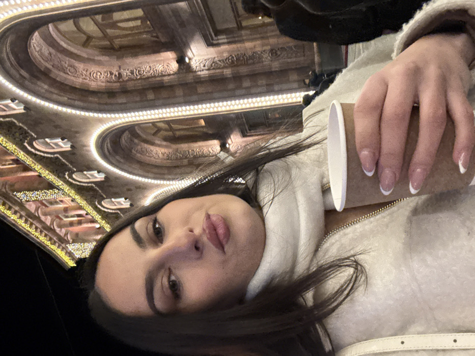 A woman gazes at the camera, holding a takeaway coffee cup. She wears a light-colored jacket and has long dark hair. French manicures adorn her nails. Ornate ceilings with decorative moldings, recessed lighting, and rows of small windows are visible above. The image appears to be rotated counterclockwise.