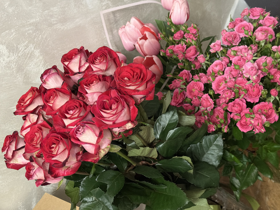 The image displays a close-up, high-angle view of multiple floral arrangements. In the upper left and central portions, a large bouquet of approximately two dozen bi-color roses is prominent, characterized by deep red petals transitioning to lighter pink or white at the edges, accompanied by dark green foliage. A segment of brown cardboard material is visible in the upper-left, adjacent to this bouquet. To the middle-right, several light pink tulips, partially enclosed in a transparent film, are observed. The lower right foreground presents a dense cluster of numerous small, vibrant pink spray roses, interspersed with green stems and buds. The background consists of a light-colored, textured wall, and a dark surface is partially visible at the bottom right. No individuals or specific actions are depicted. The scene is located in Yerevan, Armenia.