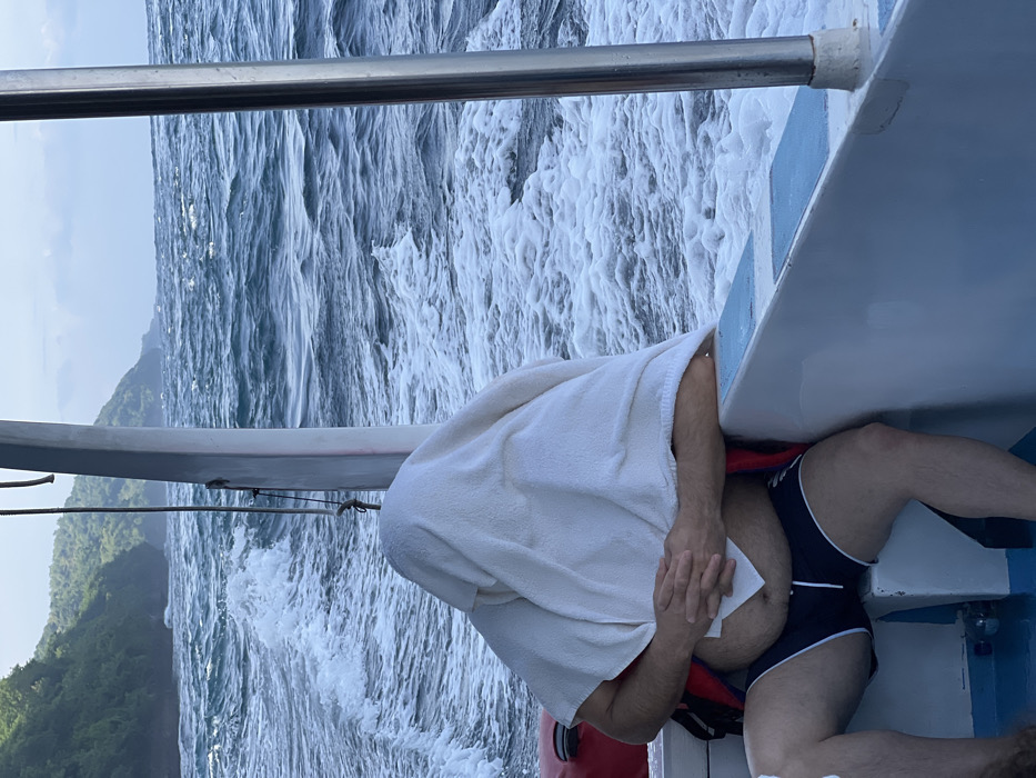 A person in a boat is covered by a white towel from the neck down. The person wears dark blue shorts with white stripes. The boat speeds through the ocean, leaving a trail of foamy water. In the background, there is a blurry view of a lush, green coastline. A metal railing and part of the boat's structure are visible in the frame.