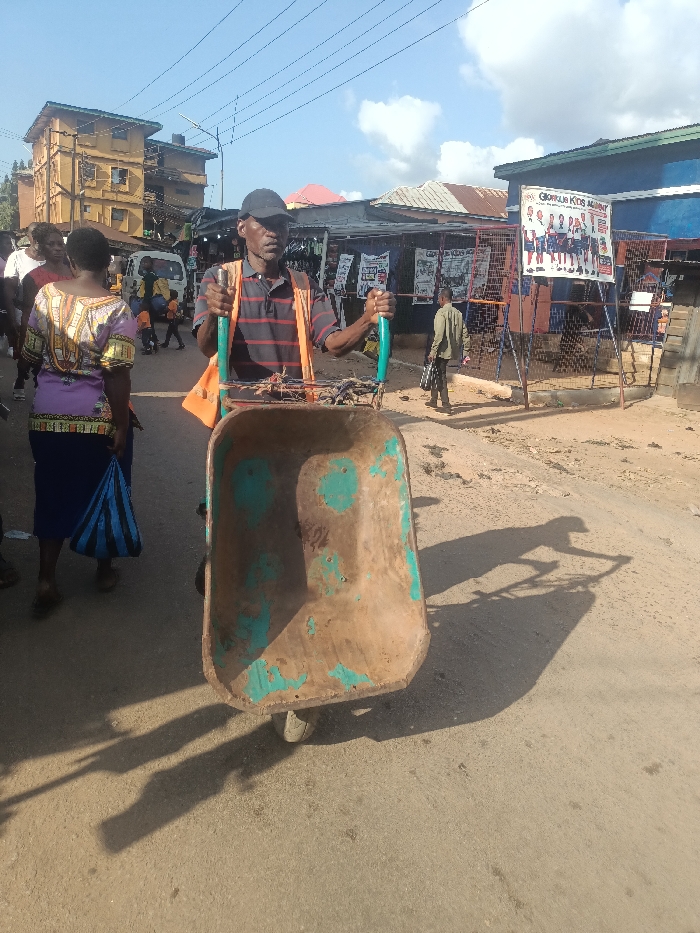 An outdoor scene in Unguwar Kaya, Nigeria, depicts a daytime street view with multiple individuals and structures. In the foreground, a dark-skinned male, approximately 50-60 years old, wearing a black baseball cap, a striped polo shirt (red, black, grey), and an orange safety vest or sash, pushes a heavily weathered wheelbarrow. The wheelbarrow's basin is predominantly brown with significant patches of faded teal paint and contains an unspecified dark material. He grips the wheelbarrow's handles, which are also teal. His shadow, elongated, is cast onto the ground behind and to the right of the wheelbarrow. To the left of the main subject, a female figure walks away from the camera. She wears a patterned purple, gold, and black top with a blue skirt and carries a blue and white striped bag. Further in the background on the left, indistinct figures are visible near a white van, with a multi-story, yellowish-brown building beyond them. The right side of the image features a street with several low-rise structures, likely market stalls or small shops, characterized by corrugated metal roofs and blue-painted walls. Various posters and banners are affixed to these structures, including one prominently displaying "GLORIUS KIDS ACADEMY" with cartoon figures. A younger male in a light-colored shirt walks towards the right background. Overhead, numerous black power lines traverse the blue sky, which contains scattered white clouds. The ground is a paved road, appearing dusty and worn.
