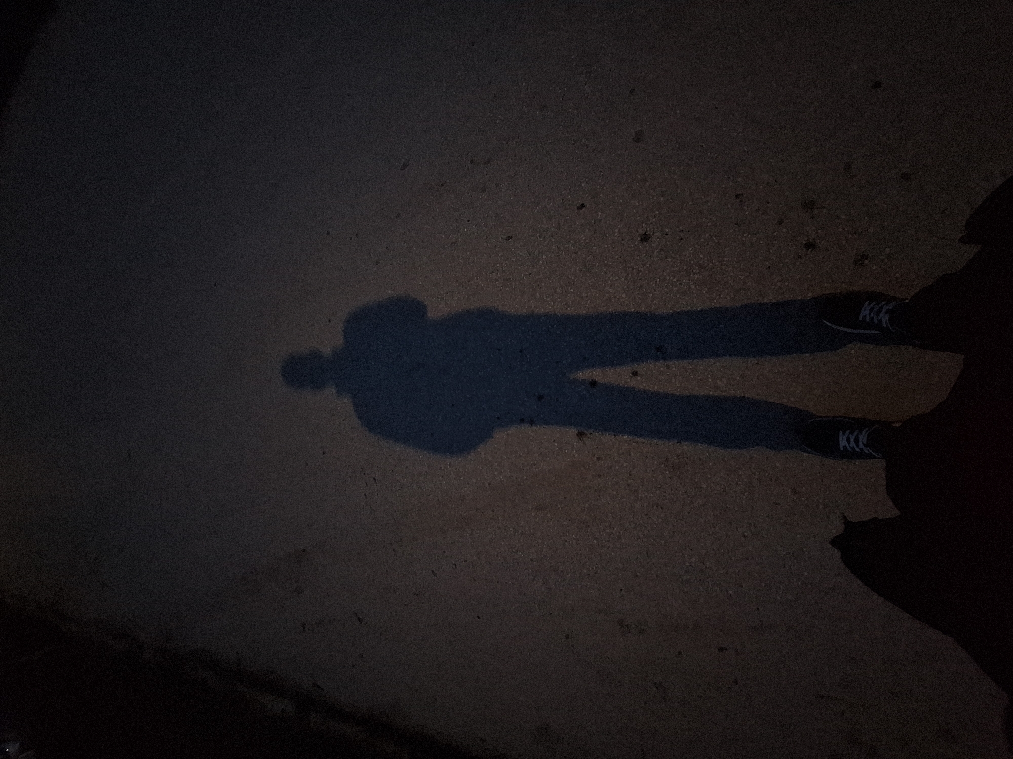 The scene depicts a ground-level view at night in Dolni Chiflik, Bulgaria. The primary subject is the elongated shadow of a standing individual, projected onto a dark, granular surface consistent with asphalt or concrete pavement. The shadow, originating from a light source behind the person, shows the outline of a figure wearing trousers and an upper garment resembling a jacket or hoodie. The feet of the individual casting the shadow are visible at the bottom edge of the frame, shod in dark sneakers with white laces. The ground exhibits scattered lighter flecks, indicating aggregate in the pavement or minor debris. A darker, undefined area runs along the left side of the frame, possibly an unlit shoulder or adjacent vegetation. There are no other discernible subjects or objects, and no interactions are depicted beyond the presence of the individual's shadow and feet.