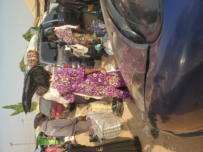 The scene depicts a busy outdoor area in Television, Nigeria, likely a transit point or market. The ground is unpaved dirt with scattered debris. The sky is clear and light blue, with buildings and a tall, slender tree visible in the background. A street light pole is present on the left. In the foreground, the hood of a dark blue car, possibly a sedan, is visible, showing signs of wear. In the midground, a red SUV with its rear hatch open is positioned behind a man in a light-colored patterned shirt who appears to be handling items in the vehicle. To the right of the red SUV, a dark-colored minivan, possibly blue or black, has its rear hatch open and multiple bundles and bags secured to its roof rack. Seven individuals are present. A woman in a vibrant purple and orange floral patterned dress stands centrally, seen from behind, facing the dark minivan. To her left, a man in a grey hooded sweatshirt with "SUZUKI" lettering and a dark cap stands, looking down. To her right, a woman in an orange, blue, and brown patterned dress and a green headwrap stands next to the minivan, holding a light-colored bag and facing the central woman, suggesting an interaction. Another person is partially visible inside the minivan, and another person in dark attire is partially visible on the far right. A person in dark clothing is also partially visible on the far left. On the ground, numerous bags and bundles, some wrapped in clear plastic, are distributed. Coils of black cable or hose are visible near a white sack on the ground to the left of the central woman. People appear to be actively engaged in loading or unloading goods from the vehicles, standing, and conversing. The overall impression is one of movement and commerce in an informal setting.