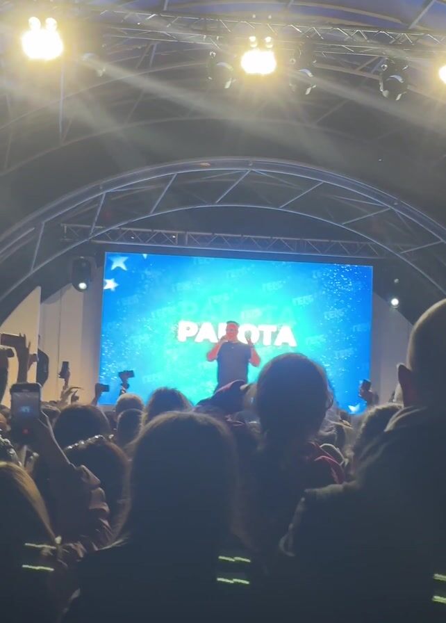 performance taking place on a stage in front of a large crowd. A man stands center stage, holding a microphone, and gesturing with his hands as he speaks. Behind him is a large screen displaying the word "РАБОТА" in Cyrillic script, set against a light blue, starry background. The stage is illuminated by bright overhead lights. The crowd, mostly silhouetted due to the lighting, is holding up phones and recording the performance. The roof structure above the stage is a metal frame.