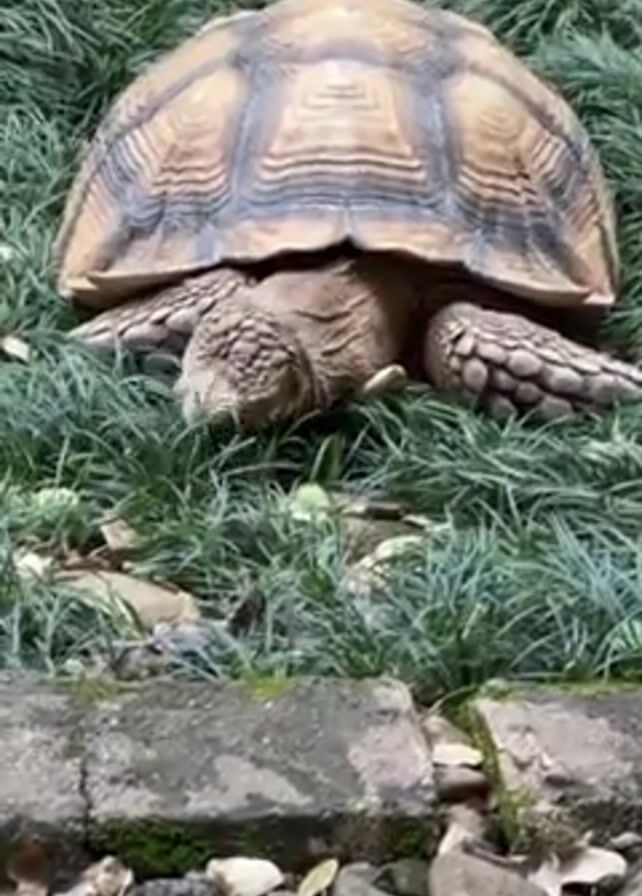 A tortoise is on green grass. A stone barrier is at the bottom of the frame. Water is trickling.