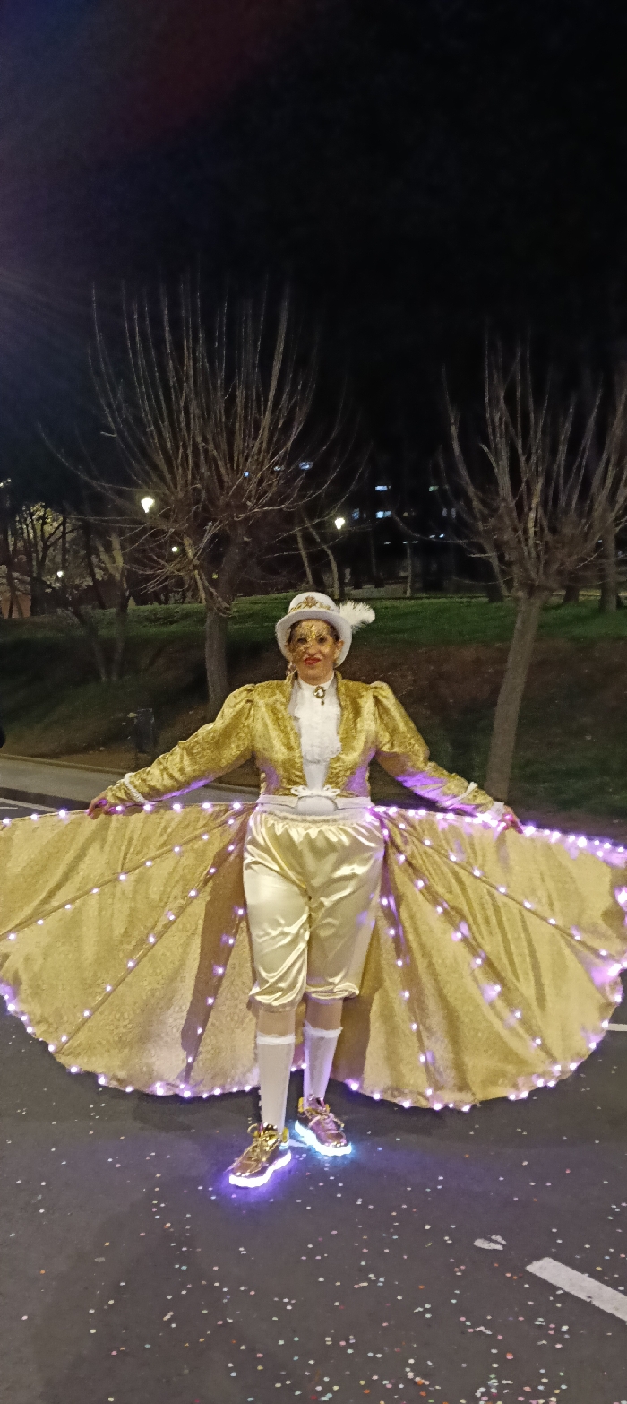 A person in an ornate golden costume stands on a street, likely for a parade. The outfit includes a jacket, pants, and a long cape-like attachment adorned with lights. A hat with a feather completes the ensemble, and the shoes also light up. The background reveals a park or street scene with trees and sparse lighting. The person has elaborate makeup and facial glitter. The ground is covered in confetti.