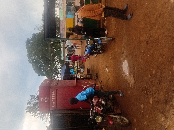 This image depicts an unpaved, reddish-brown dirt thoroughfare in Chevaywa ward, Kenya, under an overcast sky. Six identifiable individuals and two motorcycles are present. On the left, a person wearing a blue t-shirt and dark pants stands adjacent to a maroon motorcycle. Immediately to their right is a prominent red Airtel Money kiosk, labeled "Airtel money" and "Dial *222#". In the mid-ground right, a blue motorcycle is parked, with a person in a dark jacket and cap standing near it, facing the camera. Another individual, wearing an orange puffer jacket, dark pants, and blue flip-flops, stands in the right foreground. In the background, a person in a red top walks away from the camera, while other figures are visible near market stalls. One stall, covered by a blue umbrella, displays produce. Various small, informal structures and buildings line the thoroughfare, with a large green tree dominating the background skyline. The dirt ground exhibits small, wet depressions.