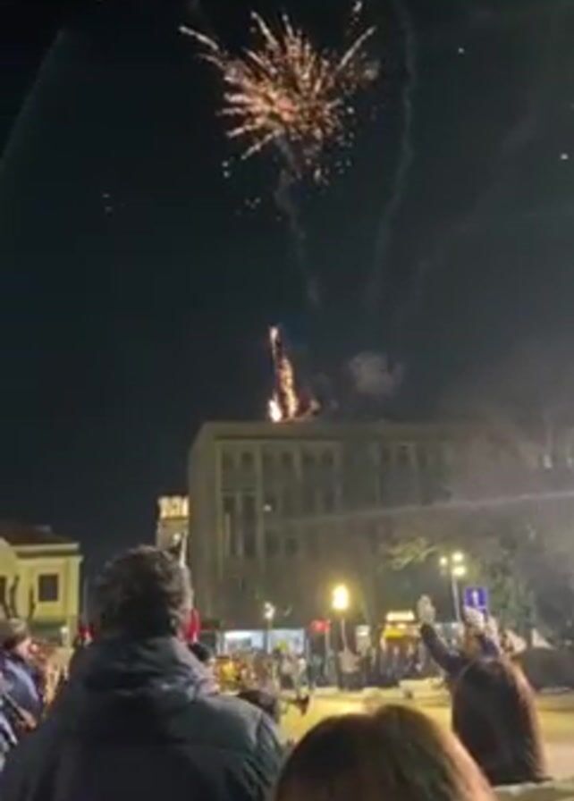 At night, fireworks light the sky over a crowd of people in an urban setting. The scene is partially filmed from inside a vehicle. The fireworks are gold in color and create a branching pattern with trails of light descending. The crowd is diverse, including people of varying ages and clothing styles. Some are looking up at the fireworks. Buildings surround the square with visible signage. The overall atmosphere is celebratory.