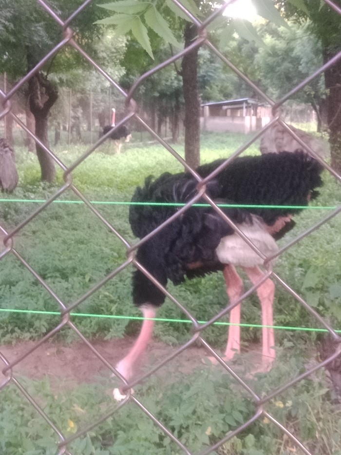 This image depicts an outdoor animal enclosure in Gandu Albasa, Nigeria, viewed through a chain-link fence positioned in the foreground. A large ostrich with black body plumage, a white-grey rump, and pinkish-beige legs is partially visible in the mid-ground, its head obscured at the bottom left as it appears to forage. A second, smaller black ostrich with a lighter neck and head stands further in the background. The ground within the enclosure consists of green grass with interspersed patches of reddish-brown dirt. Numerous trees with green foliage form the backdrop, and two thin, horizontal bright green wires are visible within the enclosure behind the fence. A small, simple building with a roof is faintly discernible in the far background. The scene is illuminated by ambient daylight.