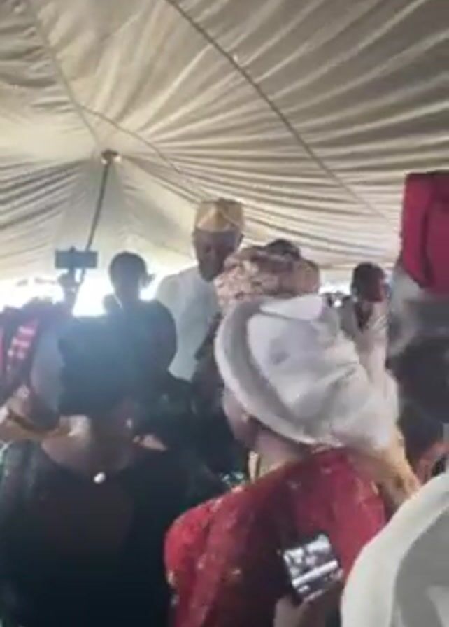 group of people gathered under a large white tent. The lighting inside the tent is bright. Several individuals are wearing traditional African clothing and head coverings. A man in a white outfit and hat is standing near the center of the group, holding a microphone, and appears to be speaking. People are moving around him, some seemingly dancing or enjoying the music. A few people are holding phones and recording. The overall impression is that of a festive or celebratory gathering.