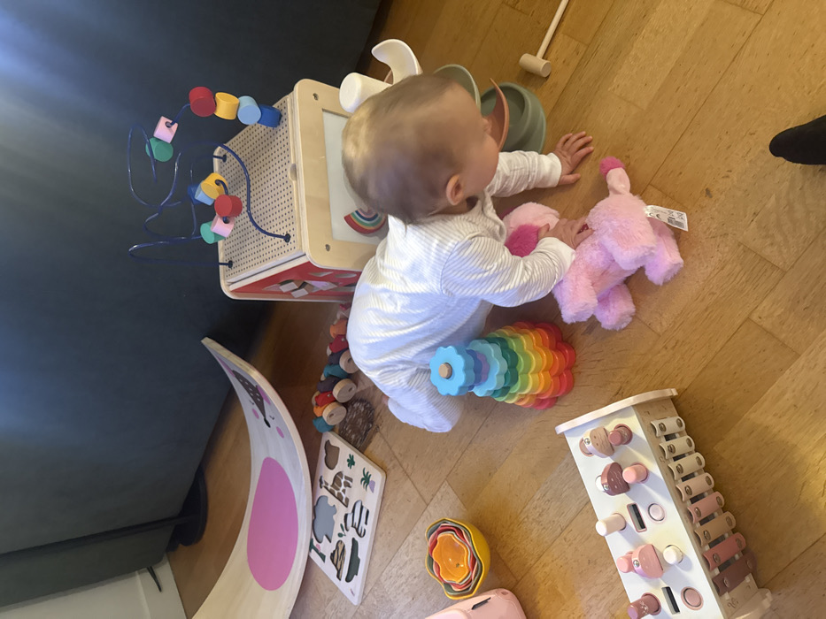 An infant, dressed in a white and light gray striped long-sleeved romper, is depicted in a crawling posture on a light-colored wooden floor within a residential setting in Rueil-Malmaison, France. The infant's head is turned to the right and slightly downward, with its right hand grasping a pink plush animal toy, which has a white tag attached. The surrounding floor area is occupied by various children's toys. To the upper left, a curved light wood balance board, featuring a pink oval and a stylized animal face, rests against a dark gray upholstered sofa. Adjacent to the balance board is a flat wooden puzzle board with animal and plant-shaped cutouts. To the right of the puzzle, a segmented wooden caterpillar toy with rainbow-colored sections and wheels is positioned. In the upper-right portion of the frame, a multi-sided wooden activity cube is visible, topped with a bead maze composed of blue wire tracks and various colorful wooden beads (red, yellow, green, pink, blue, orange). One visible side of the cube displays a rainbow illustration. Partially obscured to the right of the infant and near the activity cube are components of a light green and brown ball run or stacking toy, with a small wooden mallet lying beside it. Directly to the infant's left is a conical stacking toy made of multi-colored, flower-shaped wooden pieces stacked in a rainbow sequence on a central peg. In the foreground, a white wooden hammering toy featuring several pink-tipped pegs and a set of pink-toned xylophone bars is present. Further to the left, a stack of colorful nesting bowls (yellow, orange, red, blue, green) is visible. The scene is illuminated by ambient light, suggesting an indoor daytime environment.