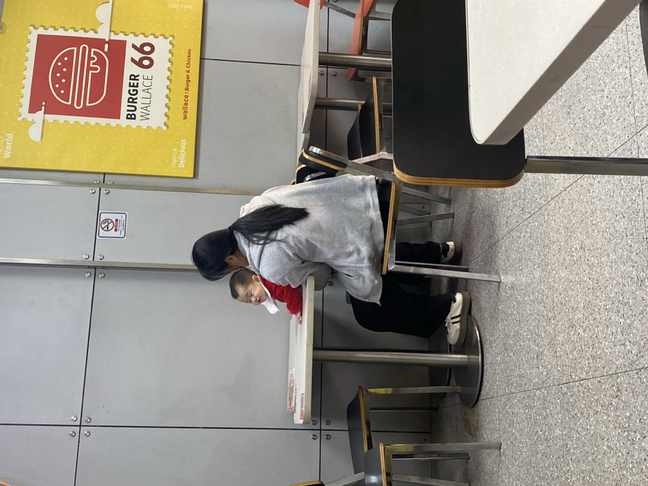 An indoor scene is depicted within a fast-food establishment, specifically a Burger Wallace restaurant or a food court containing one, located in Tianhe District, China. A female individual, observed from the rear, is seated on a chair at a light-colored, round-edged rectangular table. She wears a grey hooded sweatshirt, dark trousers, and white sneakers with black stripes. A young child, wearing a red long-sleeved top and a white bib, is positioned on the adult's lap or closely beside her, facing the table. The child's eyes are closed or squinted, and its mouth is slightly open. The floor is light grey speckled terrazzo. The background features two large wall panels: a grey panel on the left, displaying a "No Smoking" sign; and a bright yellow panel on the right, featuring an advertisement for "Burger Wallace 66," identifying it as "Wallace Burger & Chicken" and noting "Happy & Delicious, Since 2002." Multiple empty tables with light tops and metal bases, along with chairs featuring metal frames and dark seats/backs, are present. Printed material is visible on the table near the child.