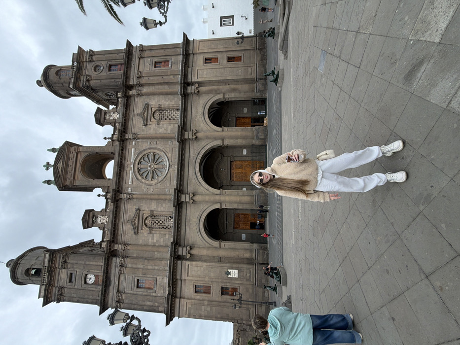 The image depicts a paved urban plaza in front of the Catedral de Santa Ana in Las Palmas de Gran Canaria, Spain, under an overcast sky
