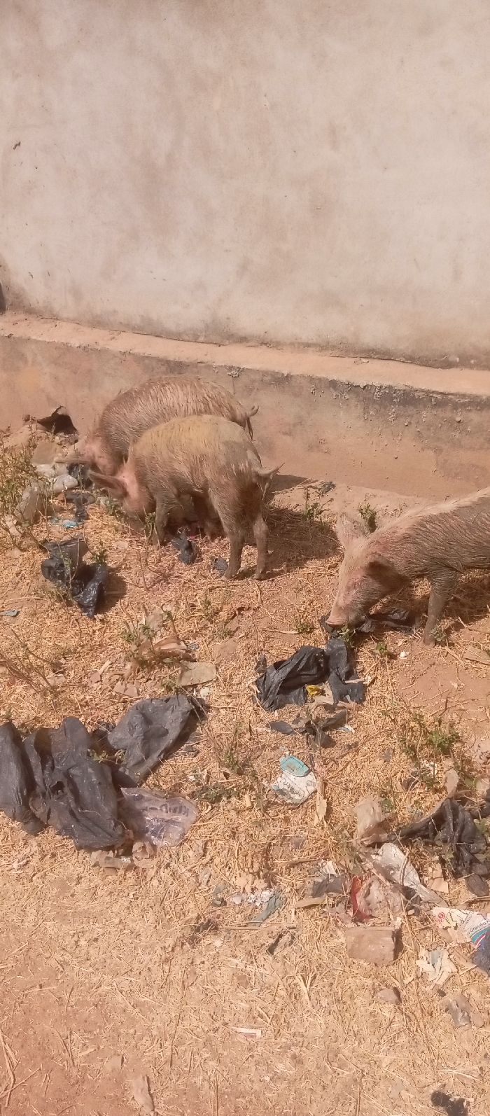 The scene is set in an outdoor environment in Rido, Nigeria, under natural lighting conditions. The ground consists of reddish-brown earth, interspersed with dry, light-colored vegetation and sparse green weeds. Scattered across the foreground and midground are various pieces of refuse, predominantly numerous crumpled black plastic bags, along with other plastic and paper debris. Three pigs are the primary subjects. They are light brown to tan in coloration, with visible coarse hair and appear coated in dirt or mud. Two of the pigs are located towards the left side of the frame, with their snouts directed downwards, actively rooting through a pile of refuse. The third pig is positioned on the right side, similarly foraging through trash. In the background, a light beige concrete wall with a textured surface extends across the frame. Its lower section features a darker horizontal band and a protruding concrete ledge or step, running parallel to the ground.