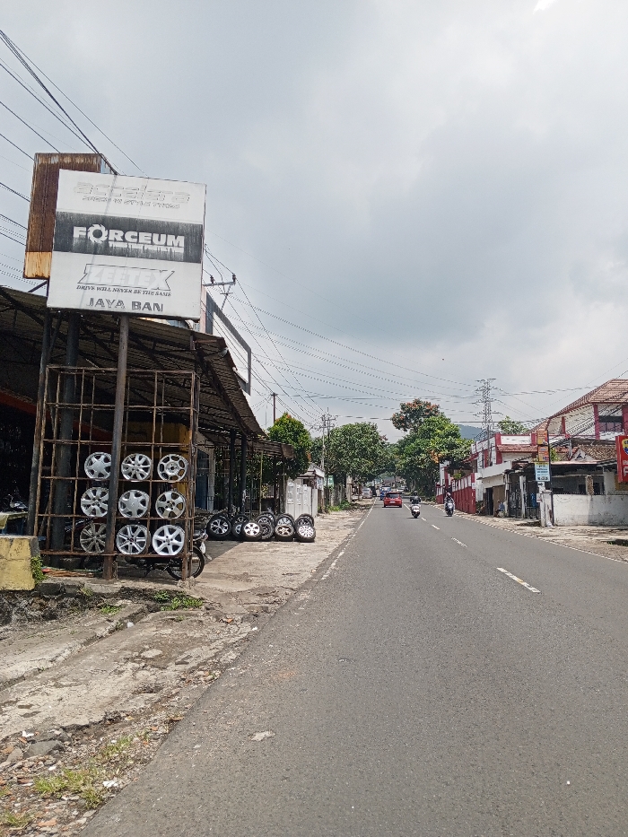 This image depicts a street scene in Multhan, India, under an overcast sky. In the immediate foreground, a cracked concrete sidewalk runs along the left side. A prominent metal rack on the sidewalk displays twelve silver-colored car wheel rims. Above this rack is a large, weathered billboard advertising tire brands "Accelera," "Forceum," and "Zeetex," with "JAYA BAN" printed at the bottom. An awning extends over the display and the adjacent building. Further down the sidewalk, additional tires and rims are stacked horizontally. A dark-colored motorcycle is partially visible near the display rack. The central feature is a two-lane asphalt road with a faded white dashed centerline, extending into the background. Three vehicles are present on the road, traveling away from the viewer: a red sedan followed by two motorcycles. Buildings, appearing to be commercial or mixed-use properties, line both sides of the street. Those on the right feature red-tiled roofs. Green trees are interspersed among the structures. In the midground and background, numerous utility poles and a dense network of overhead power lines crisscross the frame. A large metal lattice electricity transmission tower is visible on the right side of the road in the distance. The background shows more buildings and dense green foliage, with indistinct, hazy landforms or hills on the horizon beneath a uniformly light grey, cloudy sky.