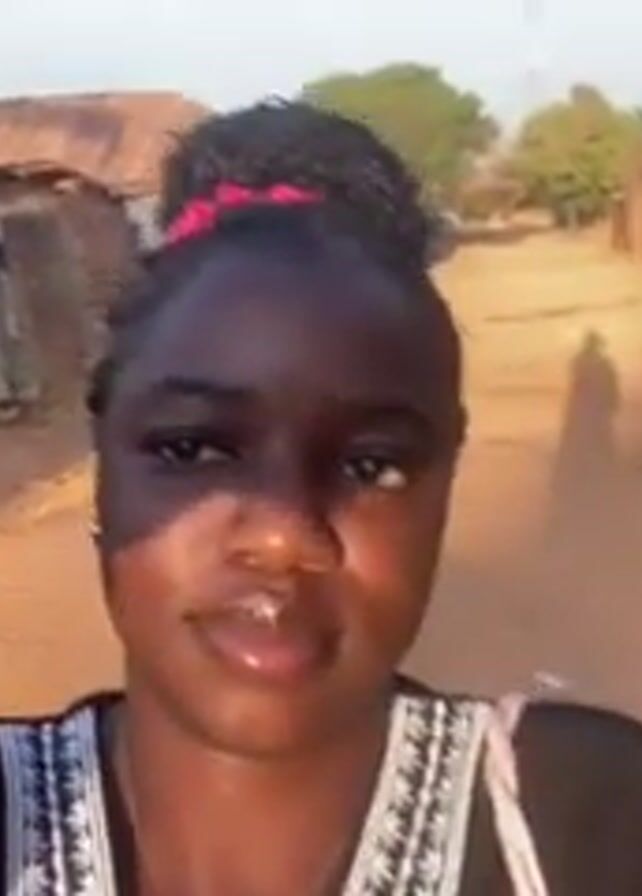A young woman with dark skin is walking down a dirt road between modest buildings, recording a video. She has her hair in a braided bun with a red scrunchie. She is wearing a black top with white detailing around the neckline. The buildings on either side of the road appear to be constructed of mud or clay bricks with corrugated metal roofs. The sky is light blue. There is a telephone pole and a satellite dish visible in the background.