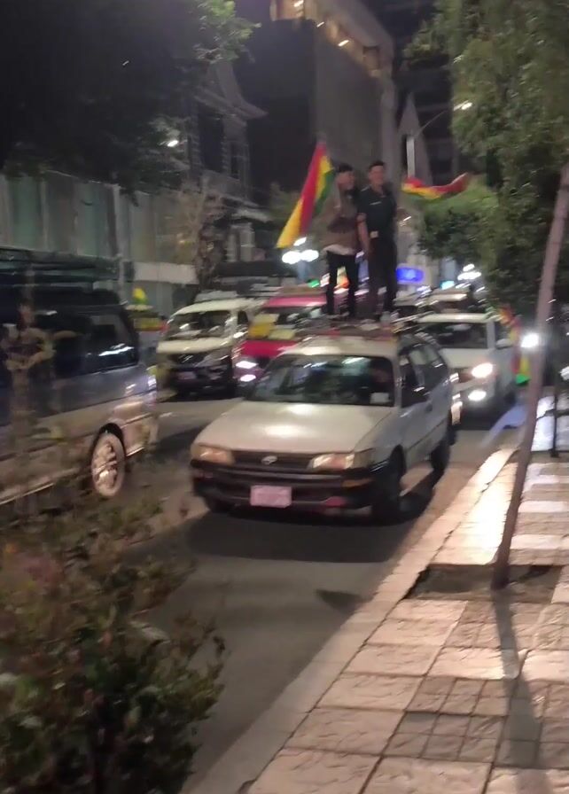 line of cars stopped at night on a city street. On the roof of a white car, two men are standing while waving the flag of Bolivia. The car is a compact sedan, and has a license plate that appears to be from Bolivia. The driver is also visible. Other cars in the line also have Bolivian flags. The road is lined with trees and buildings, and the scene appears to be a celebration.