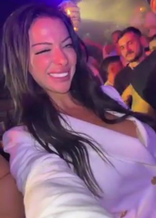 A woman with long, dark hair and striking blue eyes is taking a selfie video in a crowded indoor space that looks like a nightclub. She is wearing a white blazer. The lighting is dim with blue and purple hues. In the background, there are people dancing and socializing, with a man with a mustache prominently visible. There is a decorative light fixture resembling a ball of flowers hanging above the crowd. The woman is smiling and appears to be enjoying herself in the lively atmosphere.