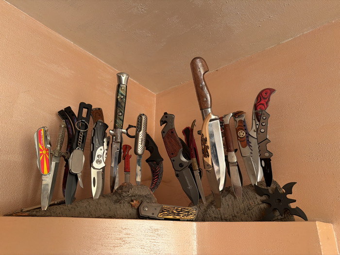 The image depicts an indoor scene in the city of Panagyurishte, Bulgaria, showcasing a collection of bladed implements displayed in a corner. The two visible walls and a horizontal surface forming a shelf are painted a uniform, light salmon-orange color with a textured finish. The ceiling, visible at the top, is white. Approximately 20 knives and bladed tools are arranged primarily upright on an irregularly shaped, dark brown piece of natural wood, possibly a root or branch, which serves as a display stand on the shelf. The wood exhibits a rough, organic texture. From left to right: 1. A folding knife with a handle featuring a yellow sunburst on a red background, resembling the flag of North Macedonia. 2. Several folding and fixed-blade knives with various handle materials, including dark wood, synthetic materials, and a light-colored, possibly bone or synthetic, handle with a circular emblem. 3. One knife is attached to a metal keychain with an oval fob. 4. A prominent switchblade-style knife with a green and brown mottled handle stands tall near the center. 5. Another large knife features a light-brown wooden handle with visible rivets. 6. Several knives display decorative elements, such as patterned red and black handles, or ornate hilt designs. 7. A large, dark-bladed tactical knife with a red-patterned handle is present towards the right. 8. On the far right of the wooden stand, a black, multi-pointed shuriken or throwing star object rests. 9. In the foreground, horizontally laid on the wooden display, is a folding knife with a patterned tan and brown handle, possibly stag horn or bone. The knives vary in size, blade type (fixed, folding, tactical, utility), and handle design. The blades are predominantly silver-toned, with some exhibiting darker finishes. No individuals are present in the scene. The lighting appears to be ambient, originating from an unseen source, casting subtle shadows.