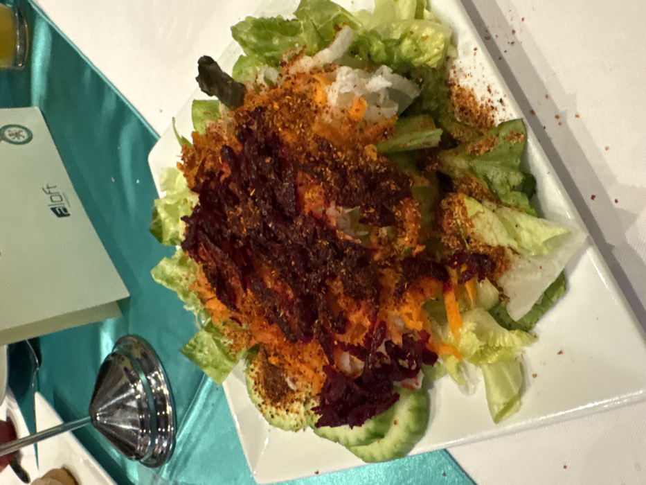 A square white plate holds a colorful salad. Green lettuce forms the base, topped with grated orange carrots, white shredded vegetables, and dark shredded beets. Round slices of cucumber ring the bottom. A reddish-brown spice is sprinkled generously over the salad. The plate sits on a table with a teal runner, next to a menu card with "Aloft" visible. Silver serving utensils are also present.