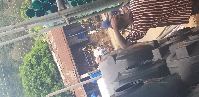 This image captures a bustling outdoor commercial area in Ado-Ekiti, Nigeria. In the foreground, multiple large, dark-grey plastic water storage tanks are stacked on the left, partially obscuring the view. To their right, the back of an individual wearing a brown and light-striped long-sleeved shirt is visible, with their right arm raised towards their head. The midground features a single-story building with a rusty, corrugated metal roof and open-front structures, indicative of multiple small shops or market stalls. An individual in a white t-shirt and blue shorts stands near a small table displaying items for sale in front of this building. Another person in blue attire is partially visible to the right, possibly on a motorcycle or bicycle. Further back, a person in a white top and dark skirt, carrying a backpack, ascends steps leading to the building. Scattered blue plastic barrels and various goods are present near the structure. On the far right of the midground, a rack holds numerous stacked green PVC pipes, suggesting a hardware or construction supply business. The background is characterized by a dense, green hillside covered in lush trees. Multiple utility poles with overhead wires extend vertically across the scene.