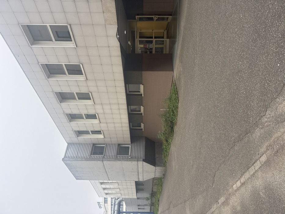 The image captures the exterior of a multi-story building situated within the Parc d'Innovation in Illkirch-Graffenstaden, Strasbourg, France, near the CERISE facility of the Université de Strasbourg. The primary structure features a light grey, tiled upper facade containing five rectangular windows with white frames. Below a dark grey overhang, the lower facade is reddish-brown with three smaller, white-framed windows. An indented entrance, positioned on the right, consists of partially open glass double doors revealing a brightly lit interior with yellow-painted walls. A red and white sign is visible inside the entrance. To the left, an adjacent section of the building exhibits exposed concrete and grey corrugated metal paneling, housing additional rectangular windows. A strip of unkempt vegetation runs along the building's base. The foreground is an asphalt surface with visible cracks, bordered by a curb on the far left. In the distant left background, another building with large blue pipes and a sign displaying the word "cerise" in white text is partially visible. The sky is uniformly overcast. No individuals are present in the scene.