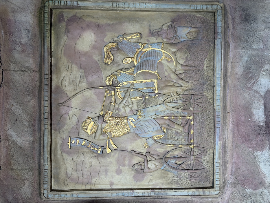 A rectangular relief sculpture, part of the Ägyptisches Portal in the Kurpark of Wiesbaden, Germany, depicts an ancient Egyptian battle or hunting scene